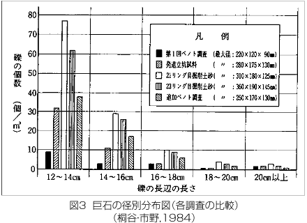 しかし、掘削や杭基礎工事においては、礫・玉石の径が問題となることも多いため、設計段階ではボーリングで採取された礫径の3倍程度を目安とすることが多いのが実情である。